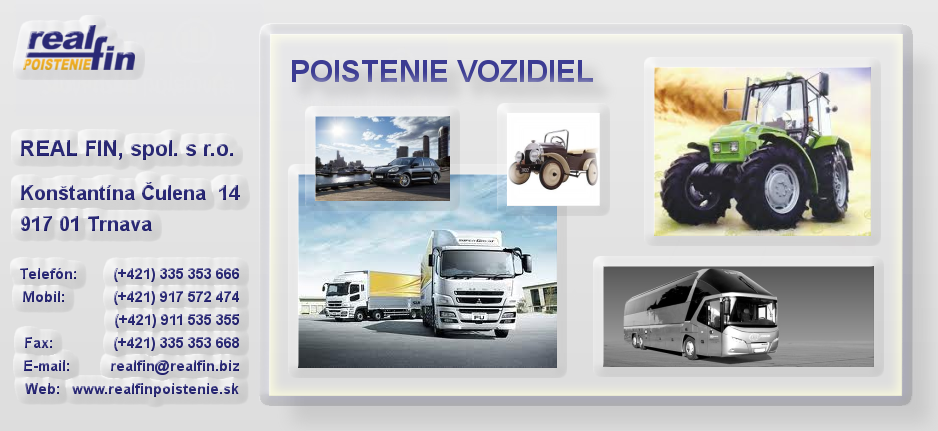 Spoločnosť REAL FIN spol. s r. o. pôsobí na poistnom trhu od roku 1997 ako finančný agent v sektore poistenia a zaistenia. Naša spoločnosť má zazmluvnené formou nevýhradnej spolupráce všetky významné poisťovacie spoločnosti pôsobiace na slovenskom trhu. Vďaka tomu vieme pre našich klientov vyhľadať optimálne poistné produkty a ponúknuť im vhodné riešenia.